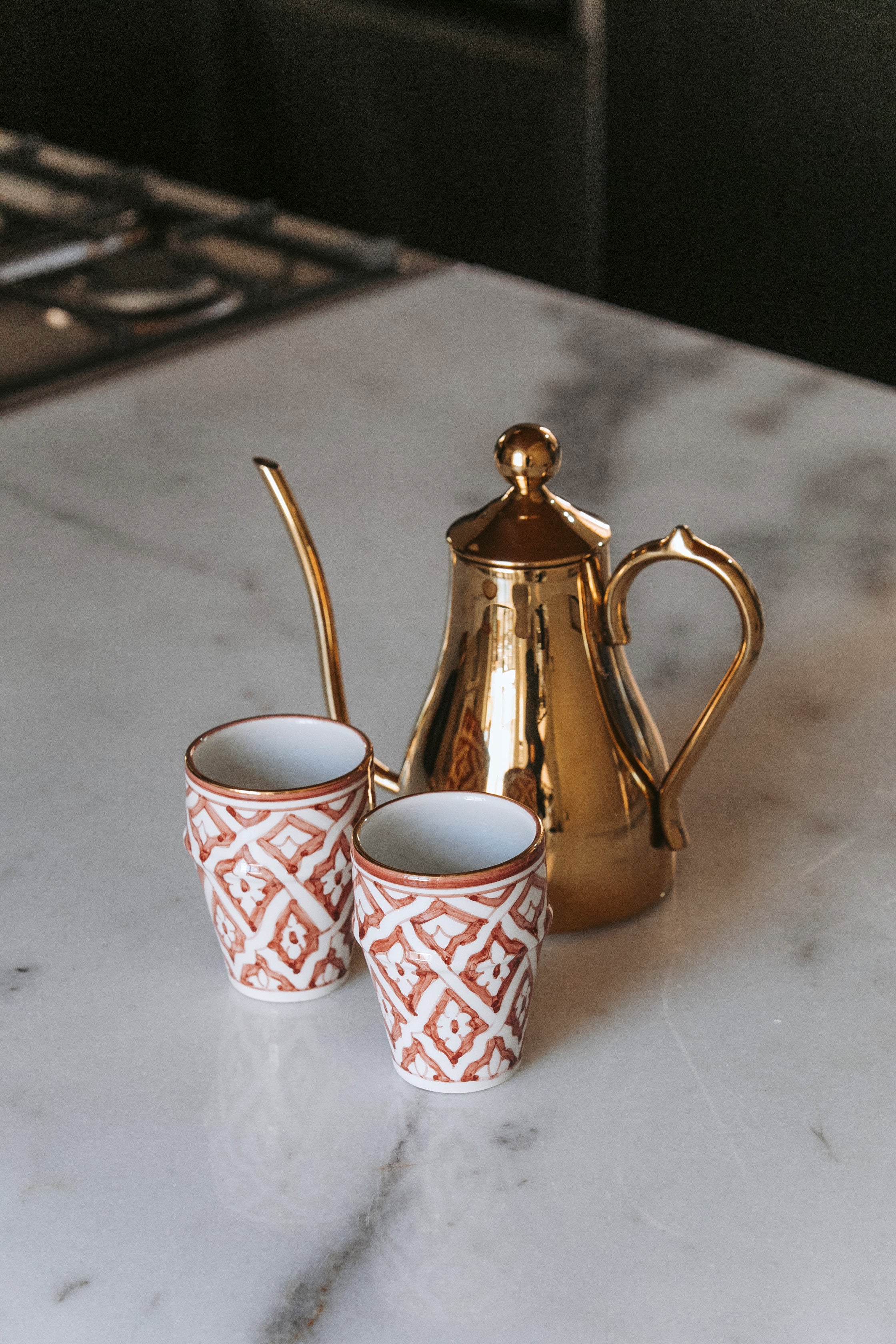 Enjoy your coffee or tea wherever you are, in this medium medium cup beldi fassia eggplant gold elegantcup, inspired by Moroccan tradition. A refined break for an intense espresso or a delicate coffee.