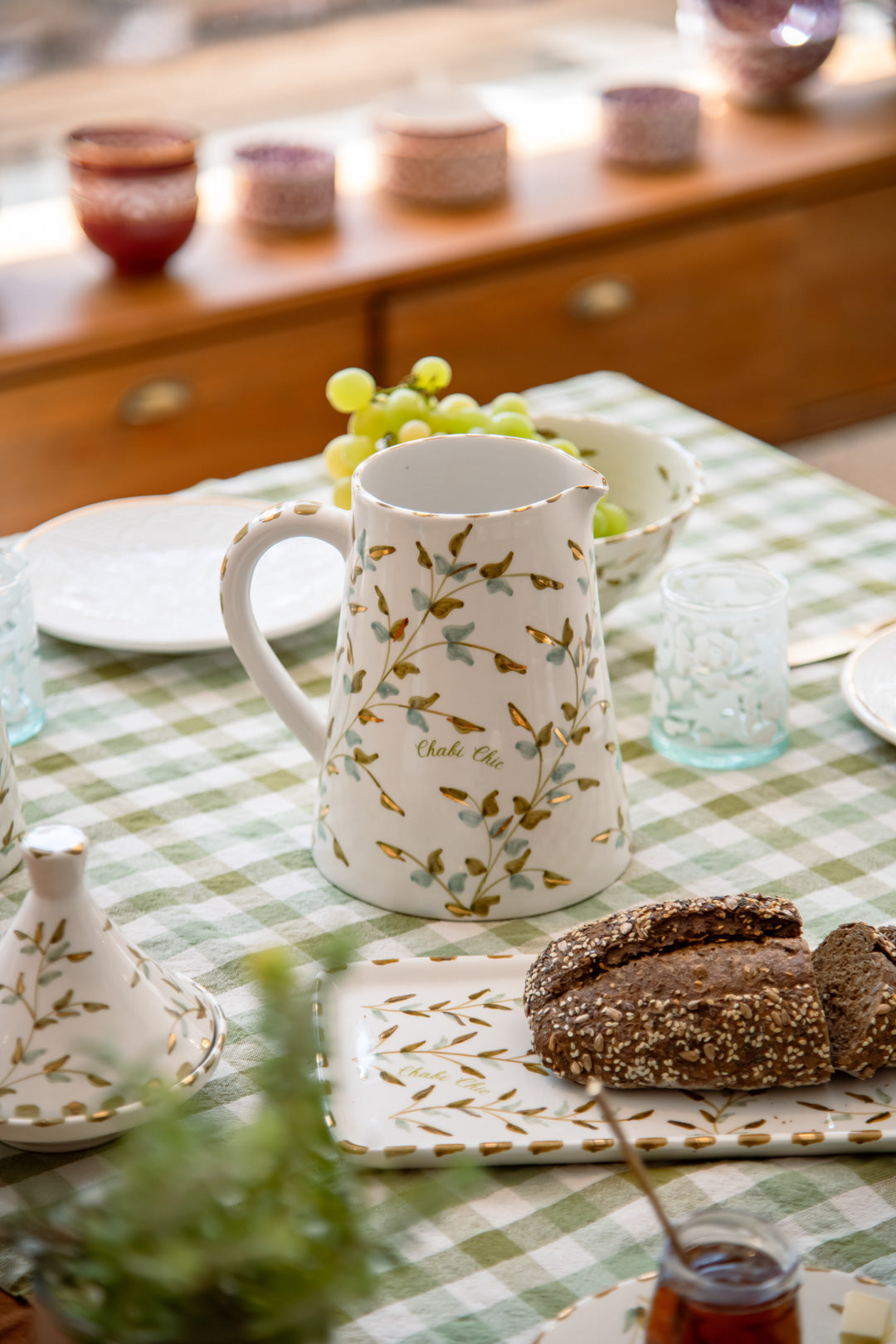 Discover our GRAND PICHET FEUILLES GOLD, an elegant accessory for your table. Ideal for serving water or juices, it adds a touch of beauty to every meal. But at Chabi-Chic, we like to reinvent the use of objects: this pitcher can also be used as a utensil jar on your worktop, adding a charming and functional touch to your kitchen.