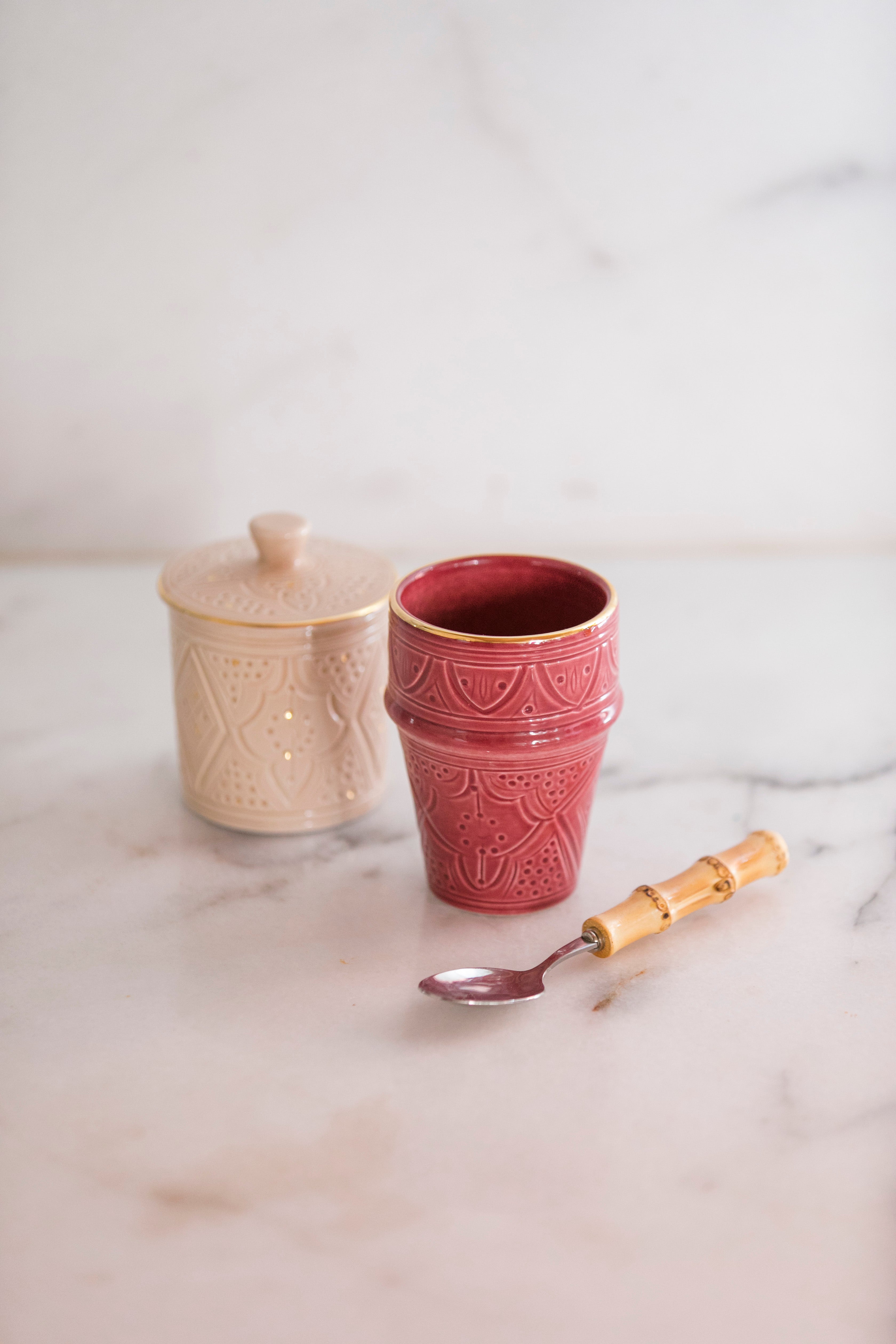 Discover the marriage between the traditional and the modern with our large beldi Empreinte eggplant gold cup , exceptionally designed for your creamy lattes and fragrant teas. The generosity of its dimensions allows you to enjoy a wide range of flavors on the palate during your tasting moments. Its refined design, inspired by traditional Moroccan cups, provides comfort and aesthetics in equal measure.