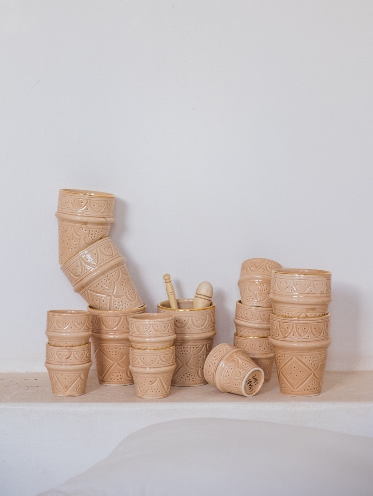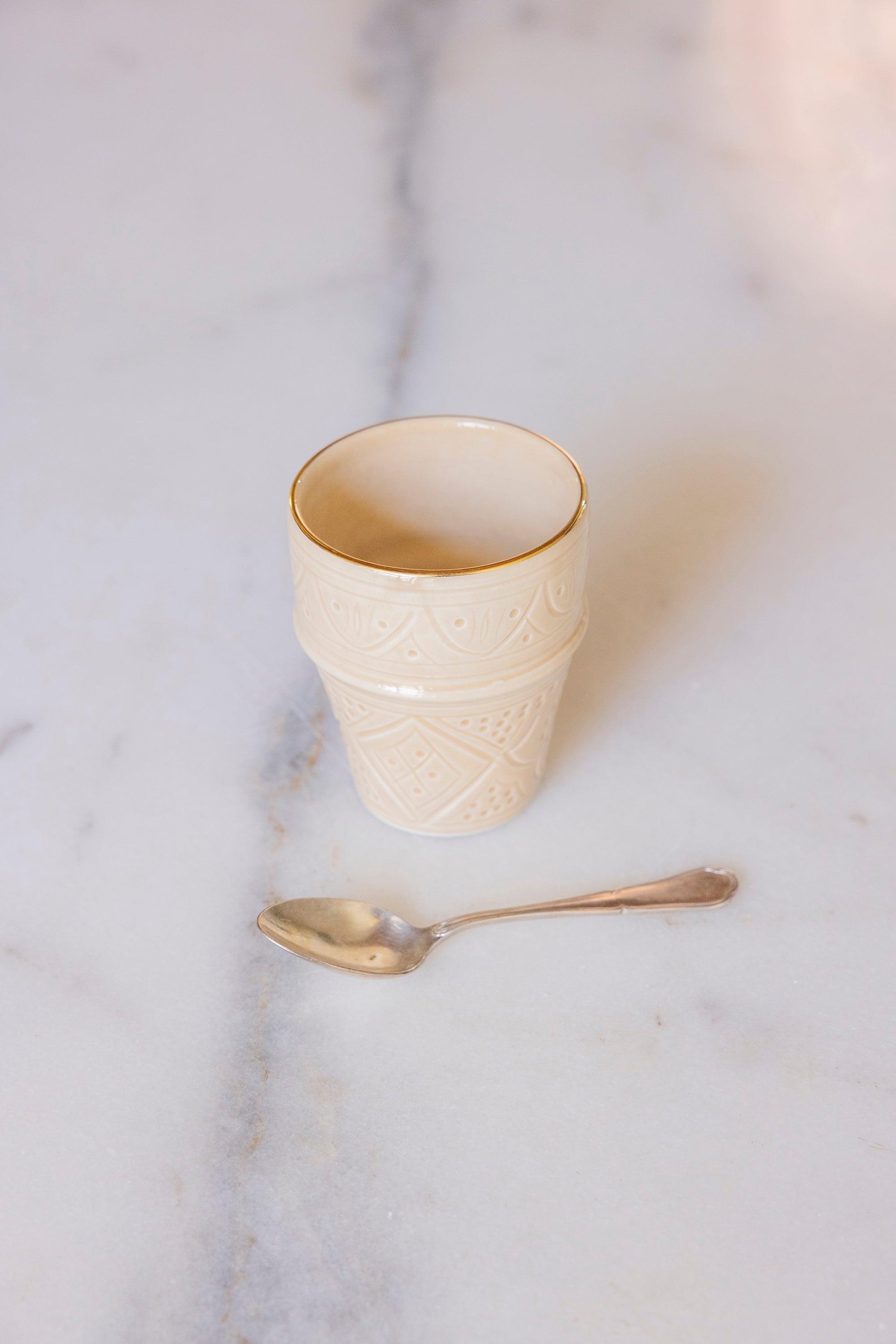 Découvrez le mariage entre le traditionnel et le moderne avec notre grande tasse beldi Empreinte sahara gold exceptionnellement réalisé pour vos cafés latte crémeux et thés parfumés. La générosité de ses dimensions vos offre une largeur esquisse de saveur sur le palais pendant vos moment de dégustation. Son design raffiné inspiré des tasses traditionnelles Marocaines, vos procures confort et esthétique à la fois.