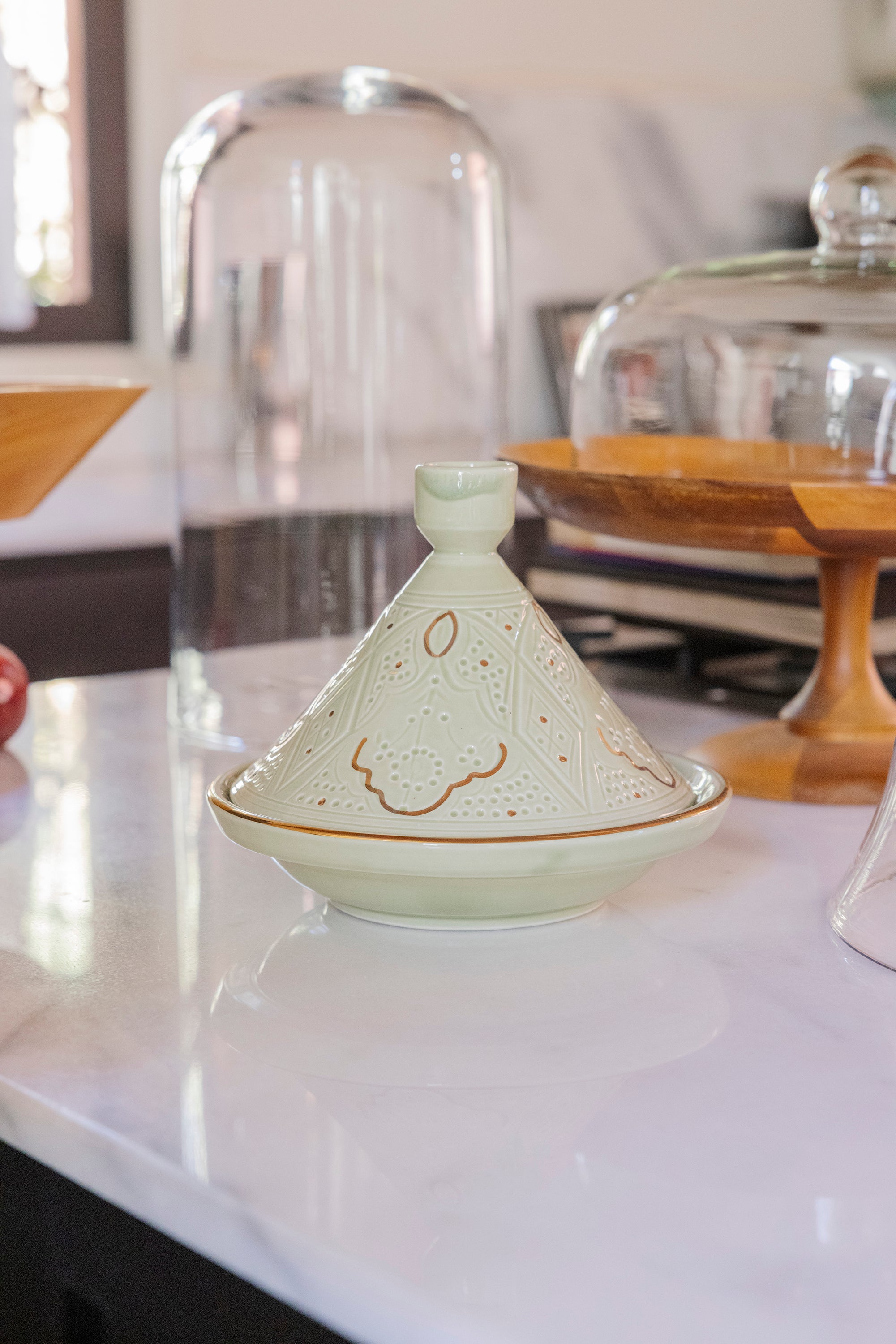 Découvrez nos Tajines Empreinte Vert Amande, des pièces emblématiques qui apportent une touche d'élégance à vos repas. Conçus principalement pour mettre en scène et présenter vos mets, ces tajines ne conviennent pas à la cuisson, mais enrichissent visuellement votre table. Disponibles en deux tailles, ils s’adaptent à toutes vos occasions, qu'il s'agisse d'un dîner entre amis ou d'un repas en famille.