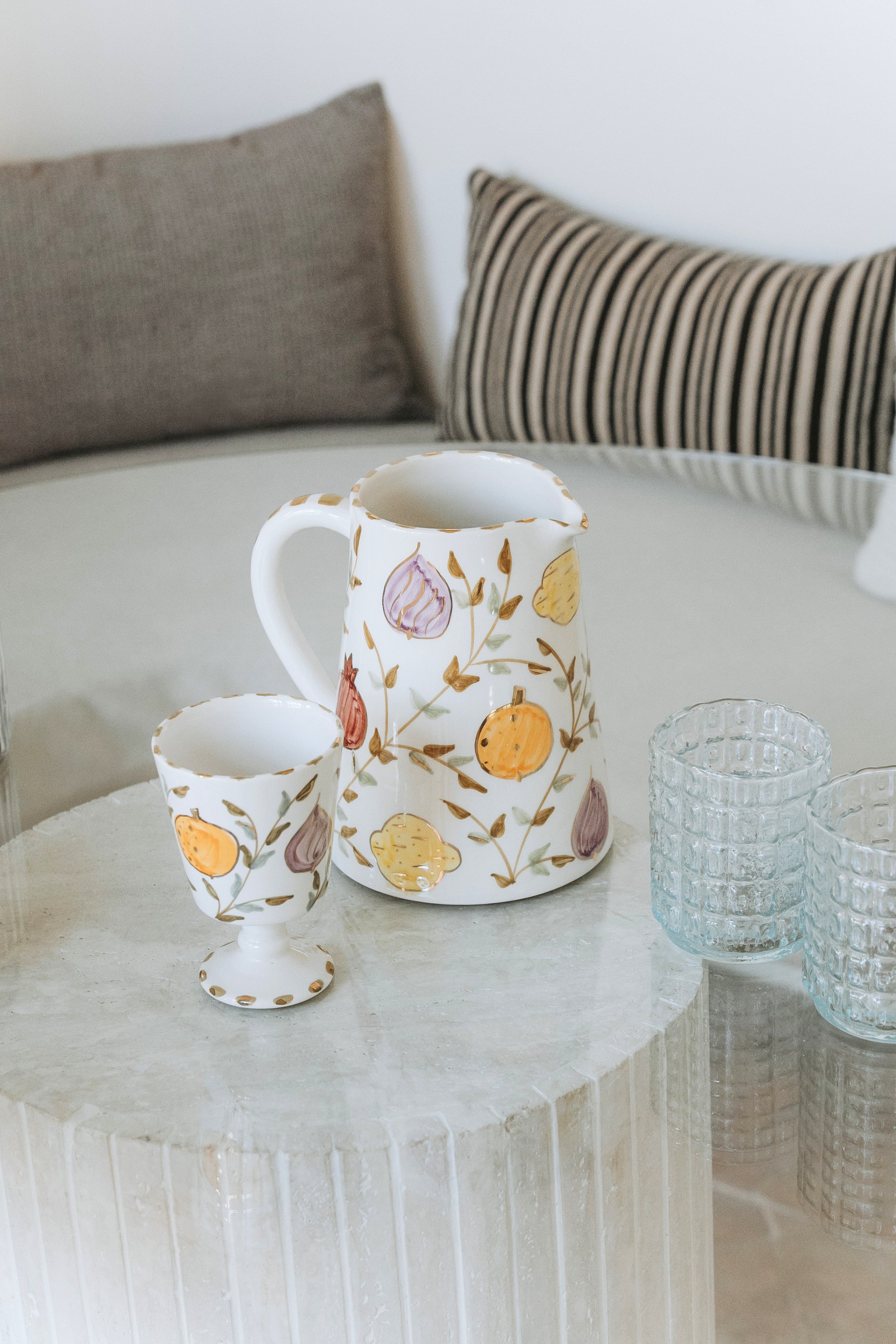 Découvrez notre GRAND PICHET TUTTI FRUTTI GOLD,un élégant accessoire pour votre table. Idéal pour servir de l'eau ou des jus, il apporte une touche de beauté à chaque repas. Mais chez Chabi-Chic, nous aimons réinventer l'utilisation des objets : ce pichet peut également être utilisé comme pot à ustensiles sur votre plan de travail, ajoutant ainsi une note charmante et fonctionnelle à votre cuisine.