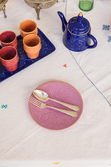 - Fabrication artisanale : Chaque pièce est soigneusement réalisée à la main à travers une dizaine d'étapes essentielles, incluant le moulage, le peinturage des motifs, l'émaillage et trois cuissons, dont la dernière révèle l'éclat de l'or véritable. Ce long processus peut prendre jusqu'à 10 jours. Ce dévouement au détail assure une qualité exceptionnelle tout en mettant en valeur le savoir-faire traditionnel marocain.