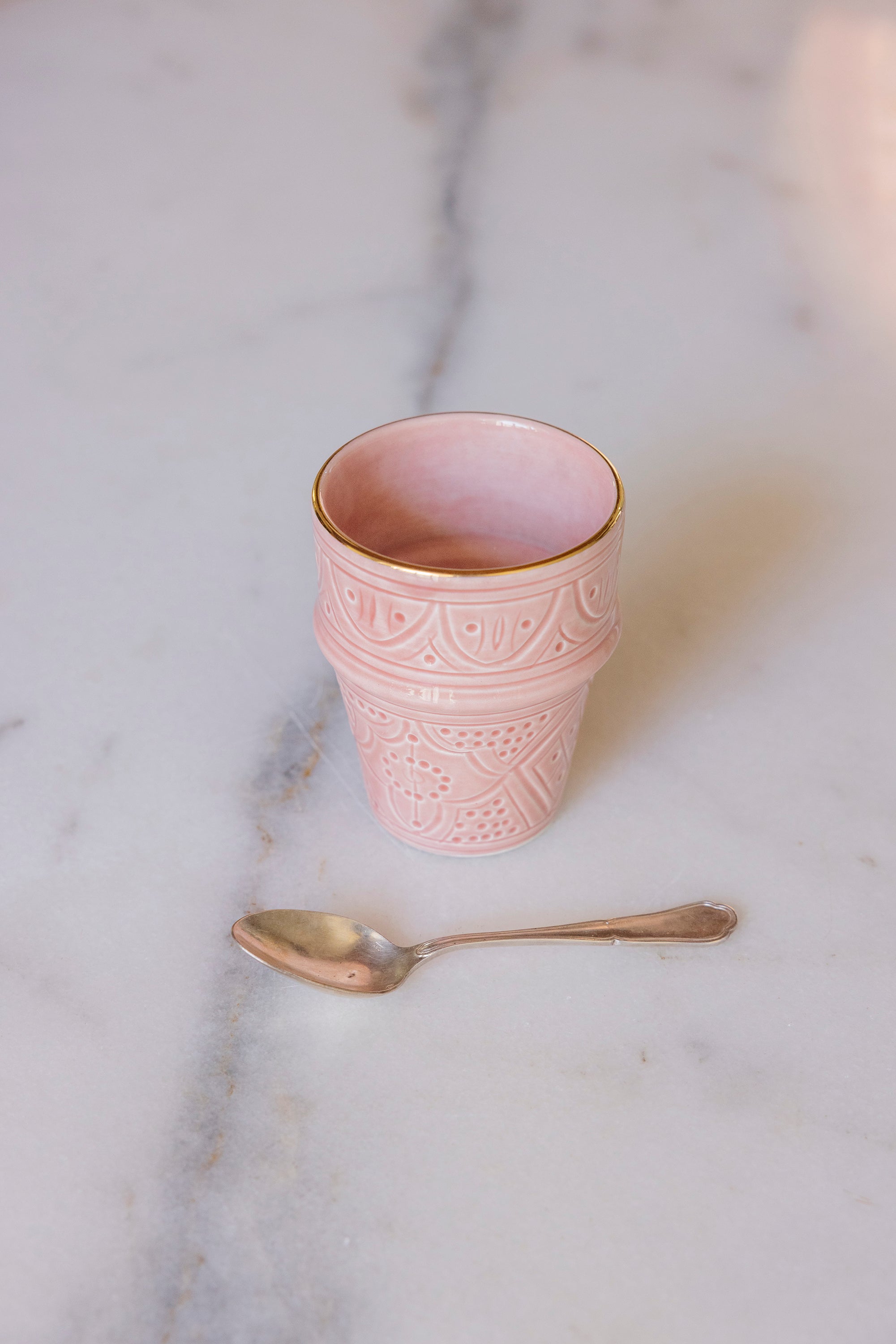 Découvrez le mariage entre le traditionnel et le moderne avec notre Grande tasse beldi Empreinte blush gold gold exceptionnellement réalisé pour vos cafés latte crémeux et thés parfumés. La générosité de ses dimensions vos offre une largeur esquisse de saveur sur le palais  pendant vos moment de dégustation. Son design raffiné inspiré des tasses traditionnelles Marocaines, vos procures confort et esthétique à la fois.