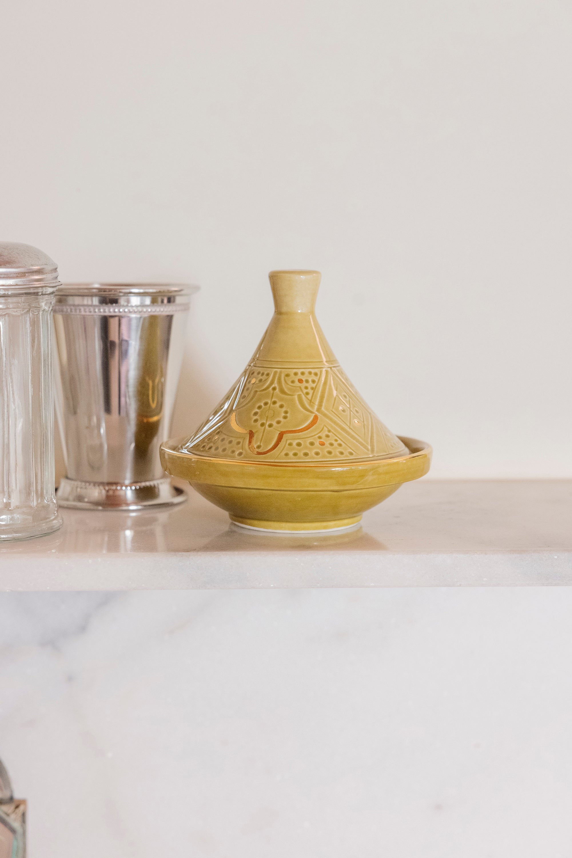 Découvrez nos Tajines Empreinte Kaki, des pièces emblématiques qui apportent une touche d'élégance à vos repas. Conçus principalement pour mettre en scène et présenter vos mets, ces tajines ne conviennent pas à la cuisson, mais enrichissent visuellement votre table. Disponibles en deux tailles, ils s’adaptent à toutes vos occasions, qu'il s'agisse d'un dîner entre amis ou d'un repas en famille.