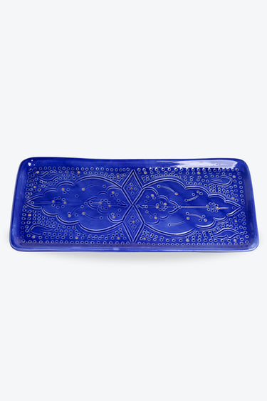 Sublimez vos créations sucrées et salées avec notre Plateau long rectangle empreinte bleu majorelle gold, l’allié chic pour présenter cakes, gâteaux ou quiches avec élégance.