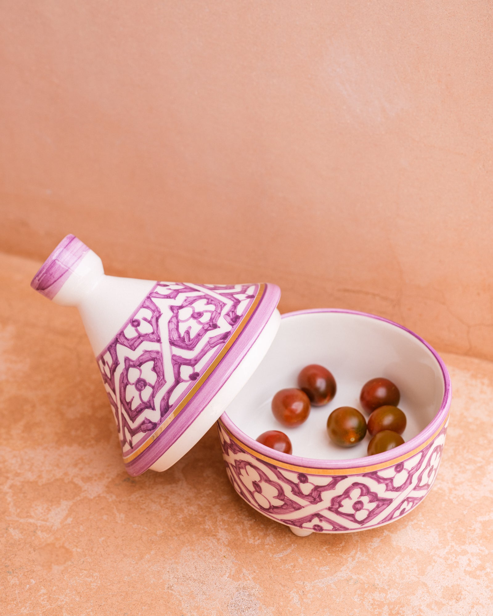 Ajoutez une touche d'élégance à votre table avec notre Boite tajine fassia lilas gold. Cette pièce emblématique a été créée pour présenter vos petits dips ou vos petites douceurs tout en mettant en valeur l’artisanat marocain. Elle peut également faire office de boîte à secrets ou de boîte à chocolats sur une table basse, ajoutant à la fois fonction et style à votre intérieur.