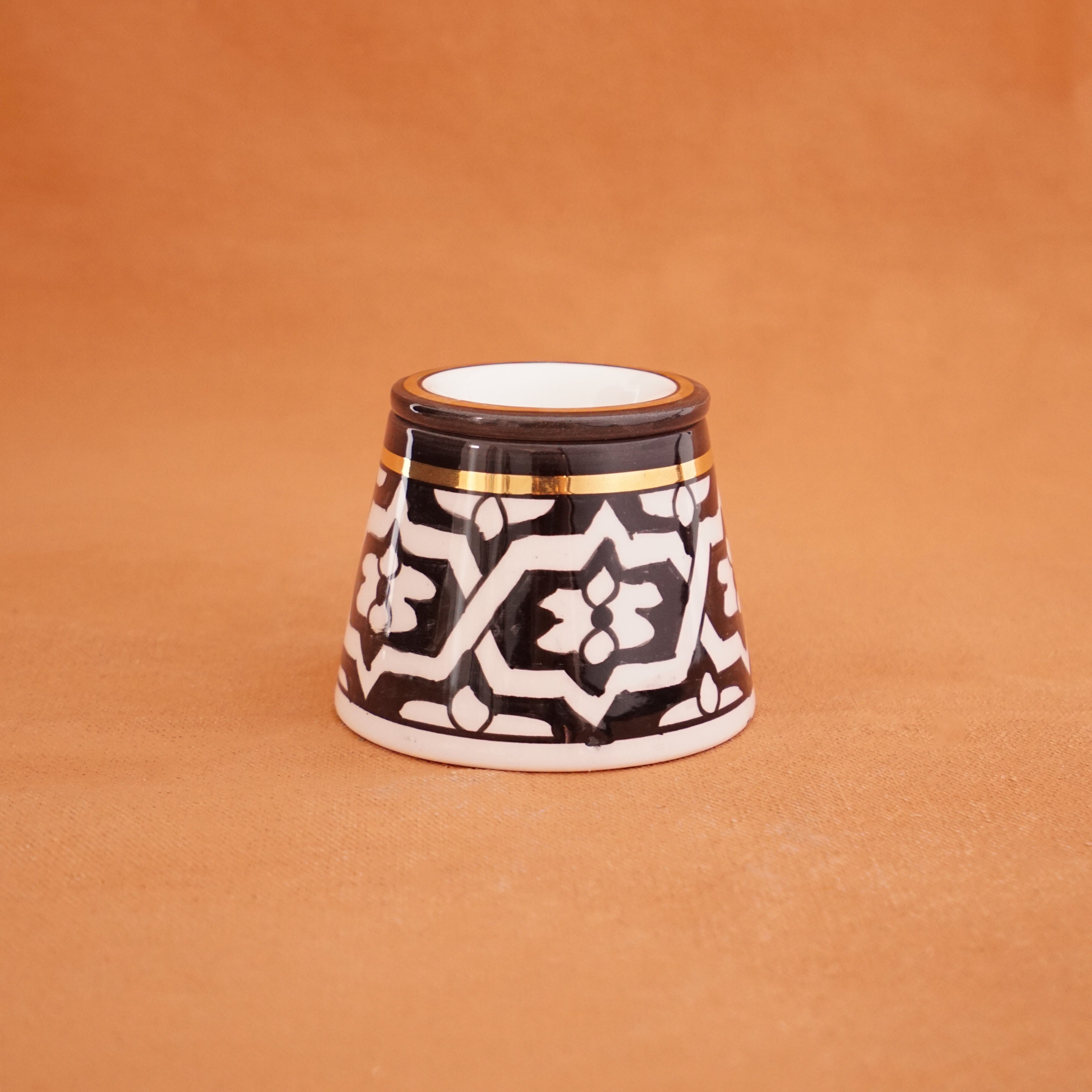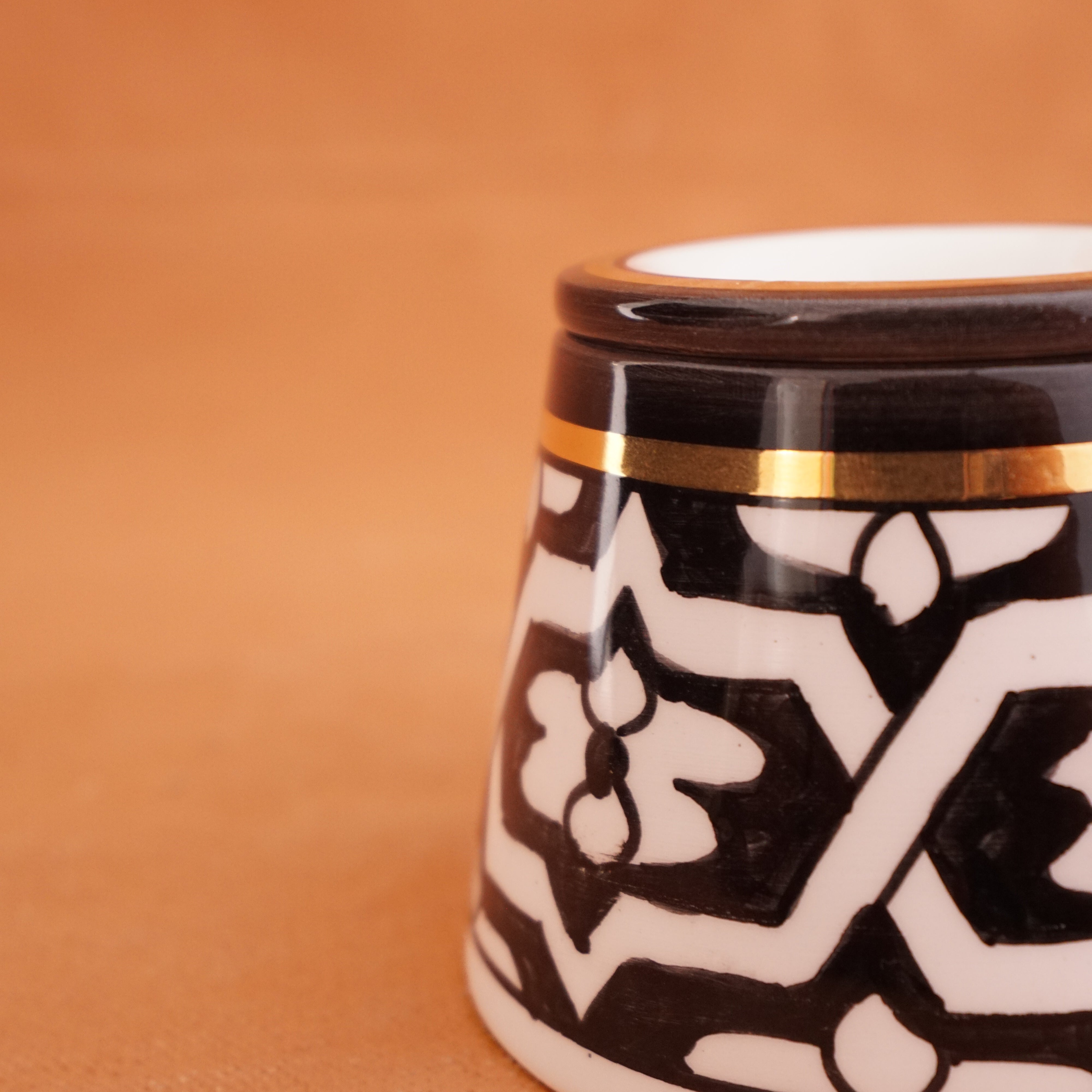 - Fabrication artisanale : Chaque pièce est soigneusement réalisée à la main à travers une dizaine d'étapes essentielles, incluant le moulage, le peinturage des motifs, l'émaillage et trois cuissons, dont la dernière révèle l'éclat de l'or véritable. Ce long processus peut prendre jusqu'à 10 jours. Ce dévouement au détail assure une qualité exceptionnelle tout en mettant en valeur le savoir-faire traditionnel marocain.