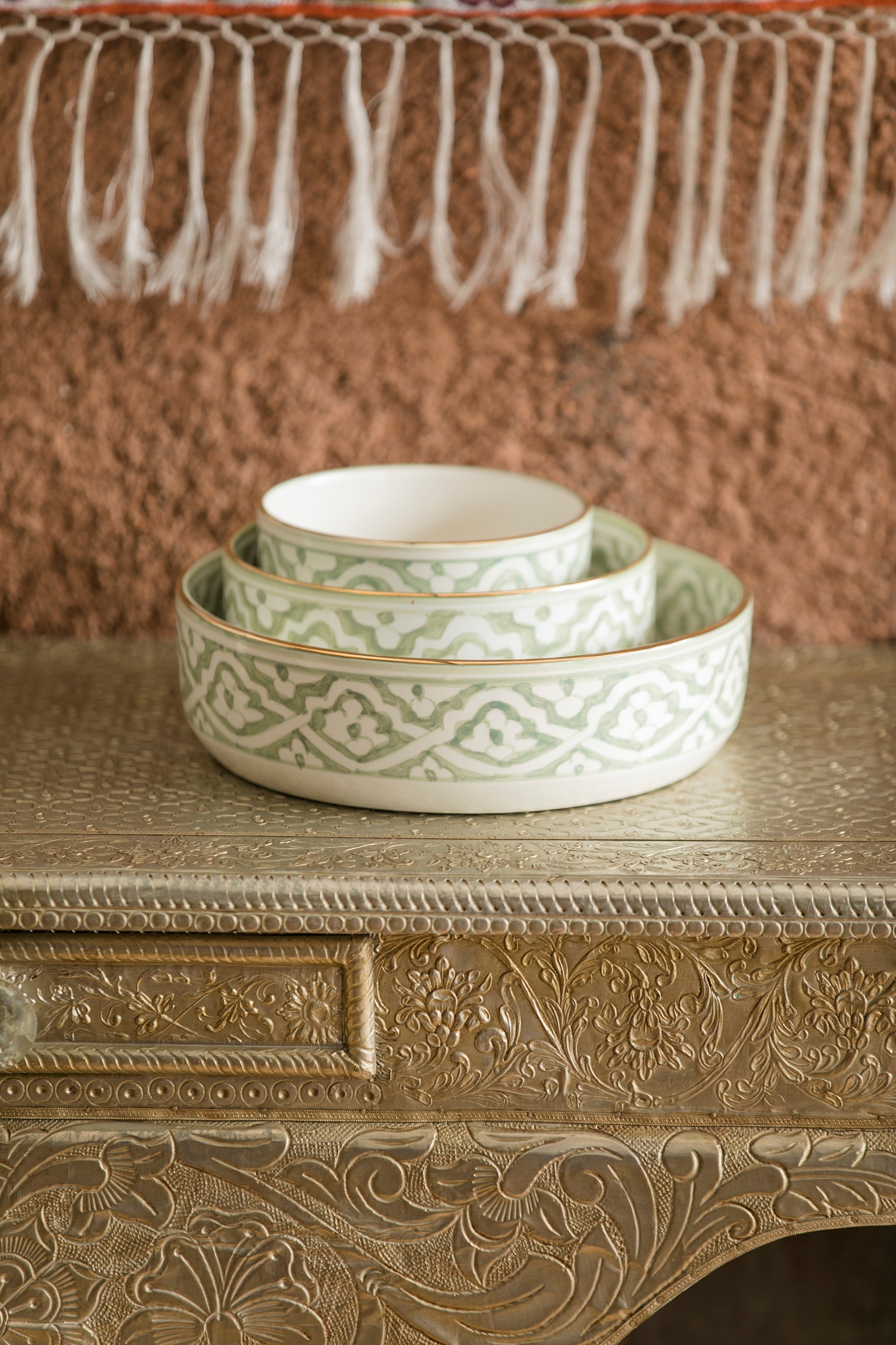 Découvrez notre collection de Plats de Service droits Fassia mint gold, qui rehausse n'importe quel service de table tout en étant surtout très pratiques. Disponibles en trois tailles — petit bol, saladier et grand plat droit — que vous serviez des entrées, des salades ou des plats principaux en sauce, ces plats répondent à tous vos besoins culinaires tout en apportant une touche raffinée à votre table.